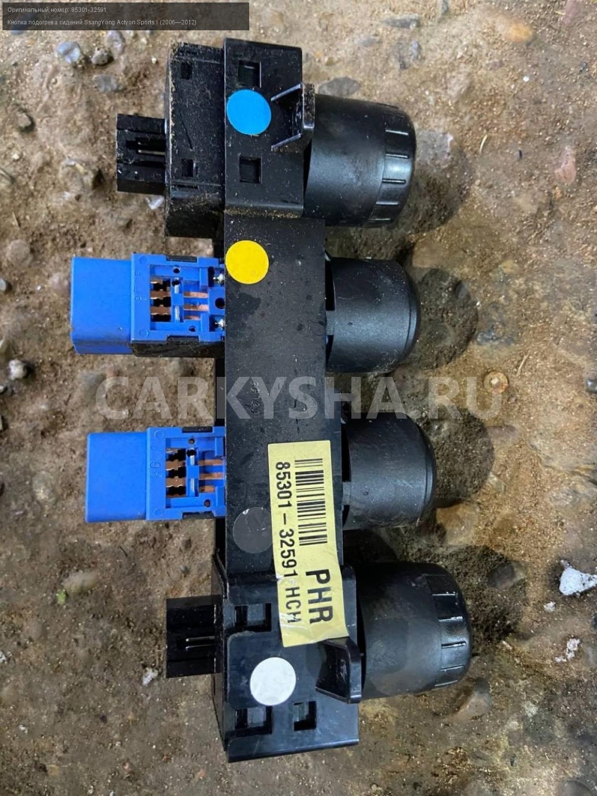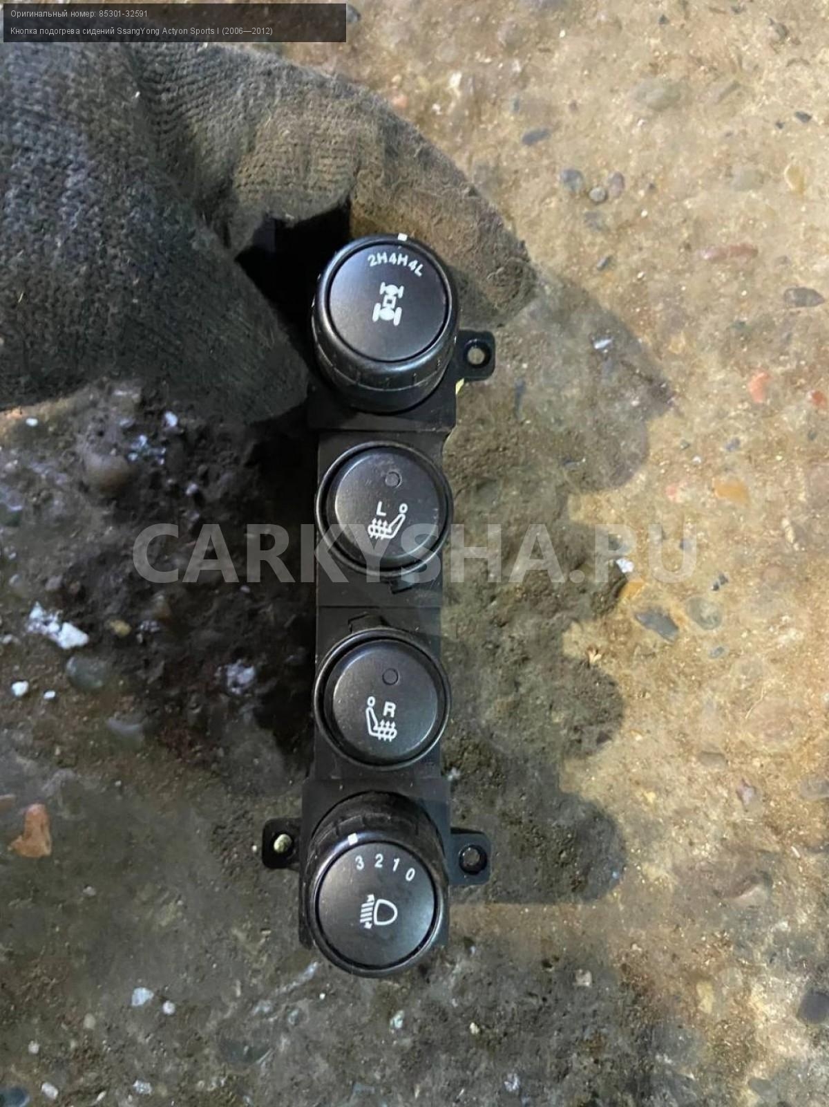 SsangYong Actyon Sports, Кнопки подогрева сидений.\nАртикул: 6753\n\nОриг. номер: 85301-32591\nПроизводитель: SSANG YONG\nПримечание:СсангЕнг Актион Спорт, Блок кнопок подогрева сидений, б/у. \n\nМарка: SsangYong\nМодель: Actyon Sports I (2006—2012)\nГод выпуска: 2008\nКузов тип: Пикап\nДвигатель номер: 664950\nМодель двигателя: турбо-дизель\nОбъем: 2.0\nТопливо: Дизель\nКоробка: Механика\nЦвет: Синий\nСовместимости: SsangYong Actyon Sports I (2006—2012) 2.0 Xdi 4WD MT (141 л.с.)\nСовместимость: