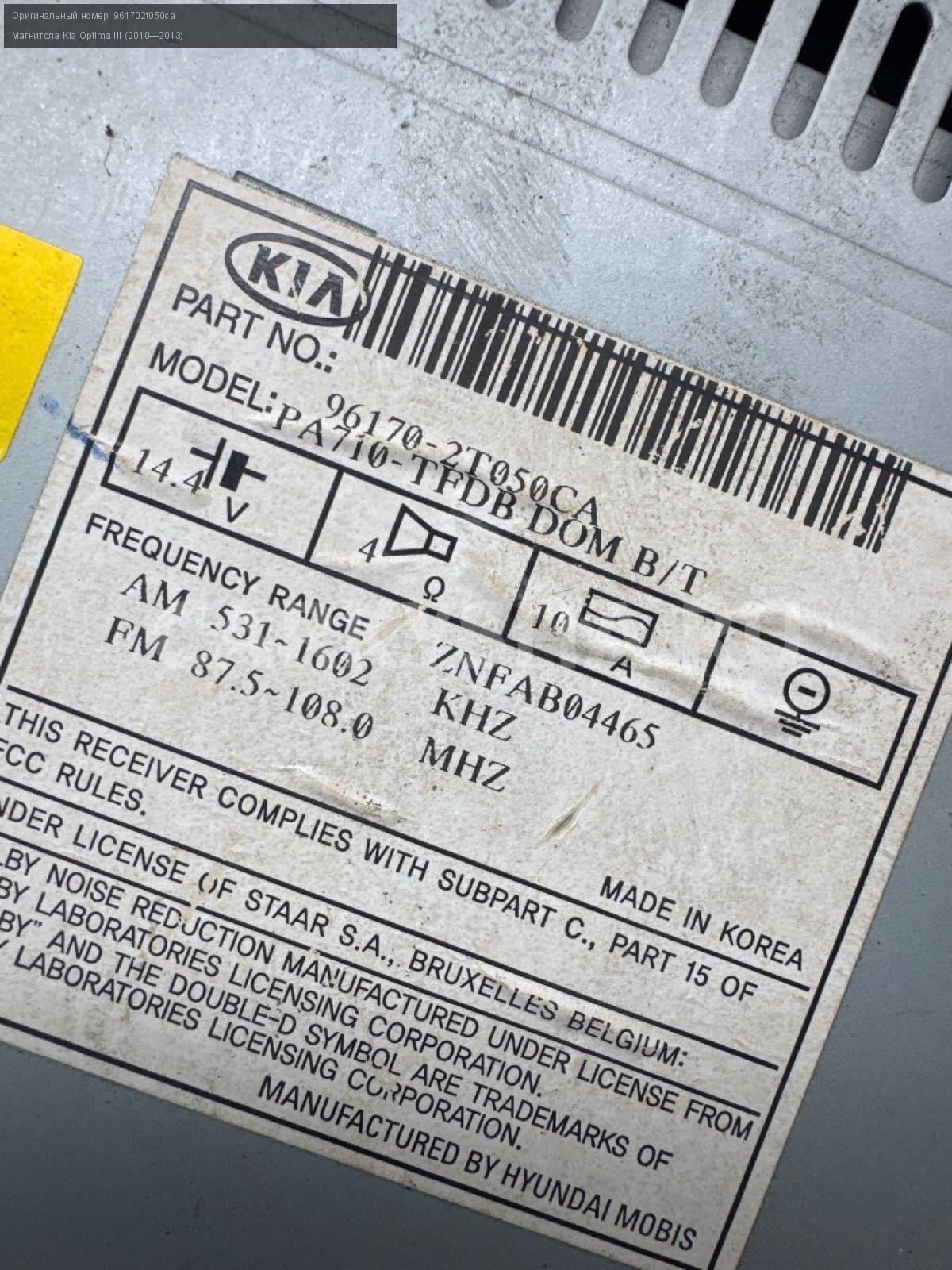 Магнитола Kia Optima III (2010—2013) Kia Optima оригинальный номер 961702t050ca